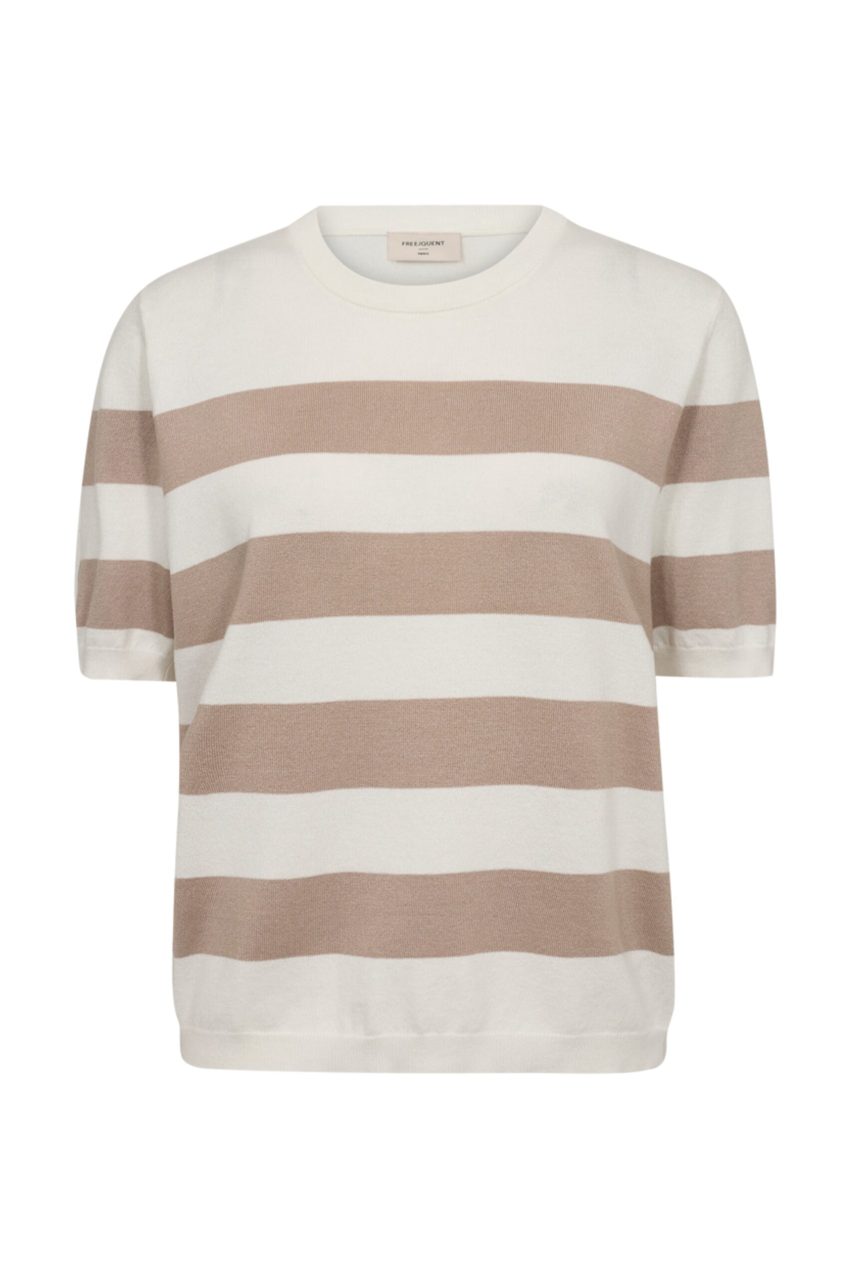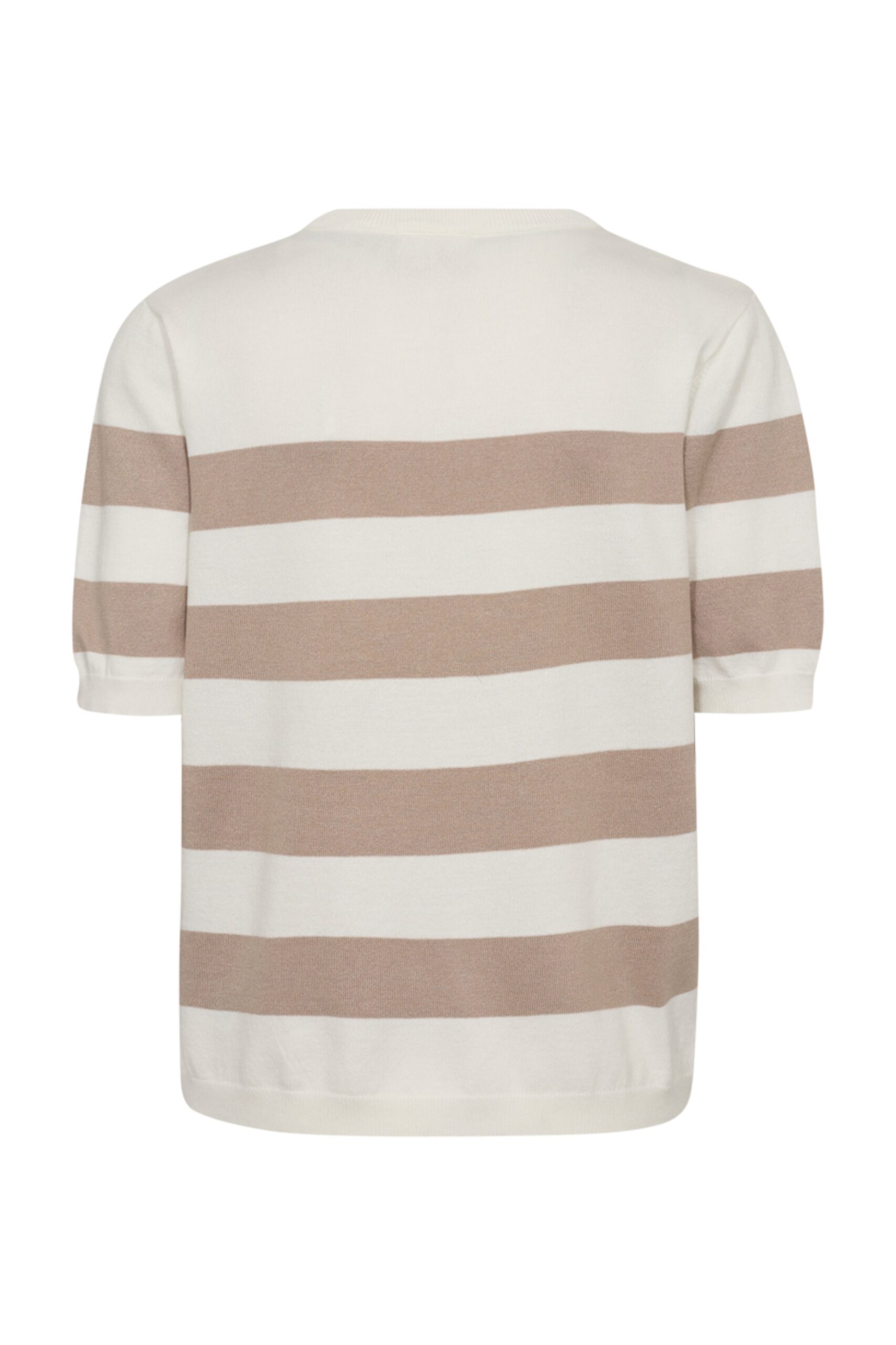 Der Rundhalsausschnitt sorgt für einen klassischen, zeitlosen Look, der sich sowohl solo als auch im Lagenlook tragen lässt. Kurze Ärmel bieten eine lockere, luftige Passform – perfekt für wärmere Tage oder entspannte Stunden zu Hause. Die neutrale Offwhite-Taupe-Farbe harmoniert mühelos mit Jeans, Röcken oder eleganten Hosen und bietet so vielfältige Stylingmöglichkeiten.